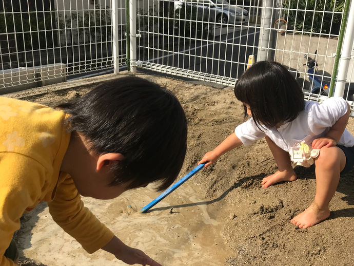 お砂場堀りました、堀りました。 お水をわんさか流して、深くまで ぢゃっぽん! びっちゃんこでしたが、 みんな楽しかったです! あたたかい、お風呂で あったまってね〜