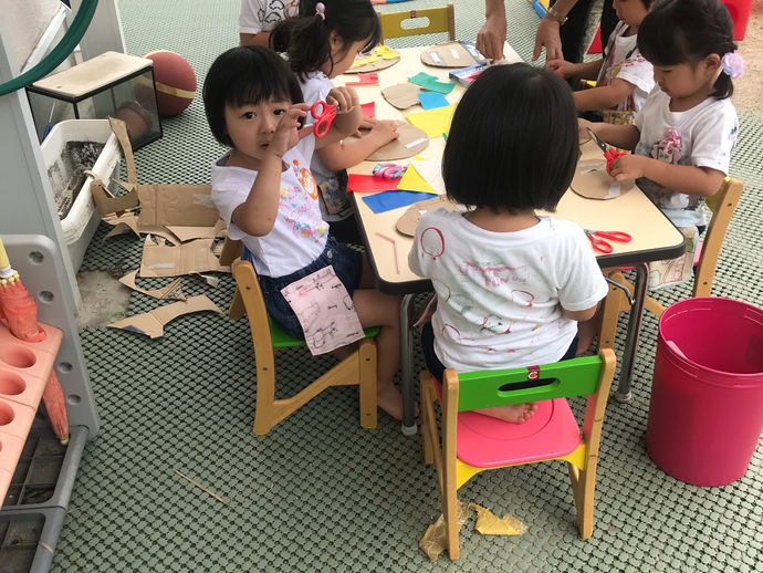 今日はみんなお外で遊びました。 テーブルもお外出ました〜 美味しそうなピザづくり! ひよこ組のお友だちがひよこ組のお友だちの靴下、上手に 履かせてあげています。