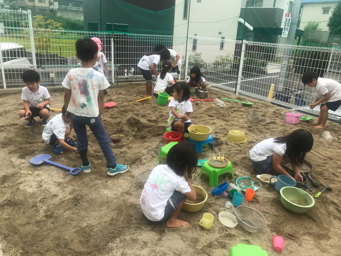 ドレスや忍者をしている古布をプールの日にみんなでお洗濯。が!子どもたちはお水の中でプカプカの大きな風船をなんども作りました〜